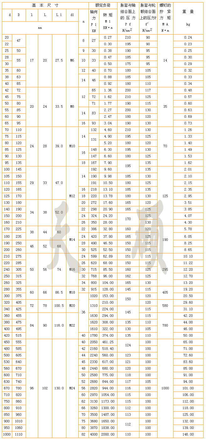 特性:Z2型脹緊套由一個開口的雙錐內環,一個開口的雙錐外環和兩個雙錐壓緊環組成。用內六角螺栓擰緊,擰緊時彈性環沒有相對于軸轂的軸向移動,與Z1型比較,同樣壓緊力能產生更大的徑向壓力,傳遞更大的載荷。為便于拆卸,在一個壓緊環上有拆卸用螺孔,沿圓周共有2~4處。鎖緊聯結盤廣泛應用于包裝、印刷、紡織、機床等機械上。