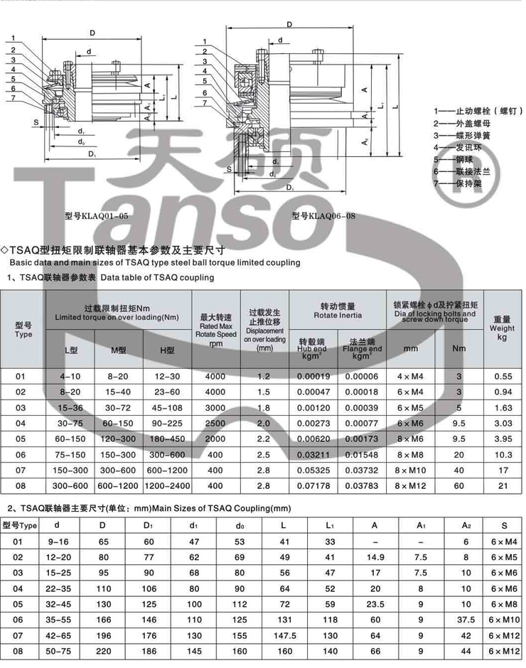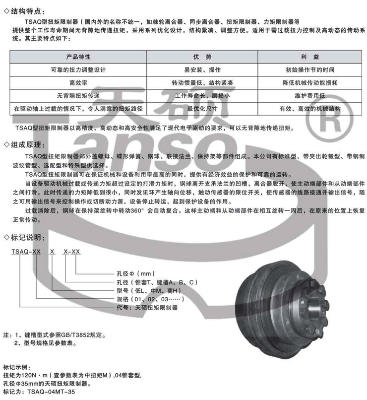 鋼球式扭力限制器工作原理:采用精密彈簧控制臨界扭矩,可以達到非常精準的扭矩值,同一外形尺寸產品,可以更換不同的內置彈簧來確定不同的打滑扭矩,用于一端是軸,一端是輪的安裝,消除過載后,復位方式為一圈*位置復位,可外接限位開關,過載時輸出電信號。