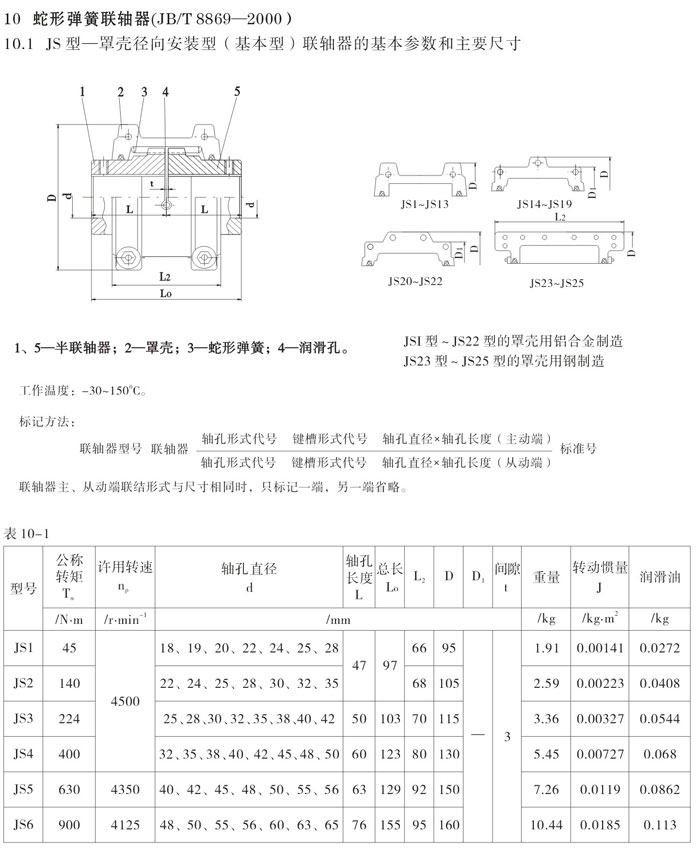 蛇形彈簧聯軸器,是一種結構*的金屬彈性聯軸器,它靠蛇形彈簧片來傳遞扭矩,也是一種非常通用的軸聯接傳動部件蛇形彈簧聯軸器共有九類型式,分別是JS罩殼徑向安裝型(基本型)蛇形彈簧聯軸器、JSB罩殼軸向安裝型蛇形彈簧聯軸器、JSS雙法蘭聯接型蛇形彈簧聯軸器、JSD單法蘭聯接型蛇形彈簧聯軸器、SJS接中間軸型蛇形彈簧聯軸器、JSG高速型蛇形彈簧聯軸器、JSZ帶制動輪型蛇形彈簧聯軸器、JSP帶制動盤型蛇形彈簧聯軸器、JSA安全型蛇形彈簧聯軸器等。